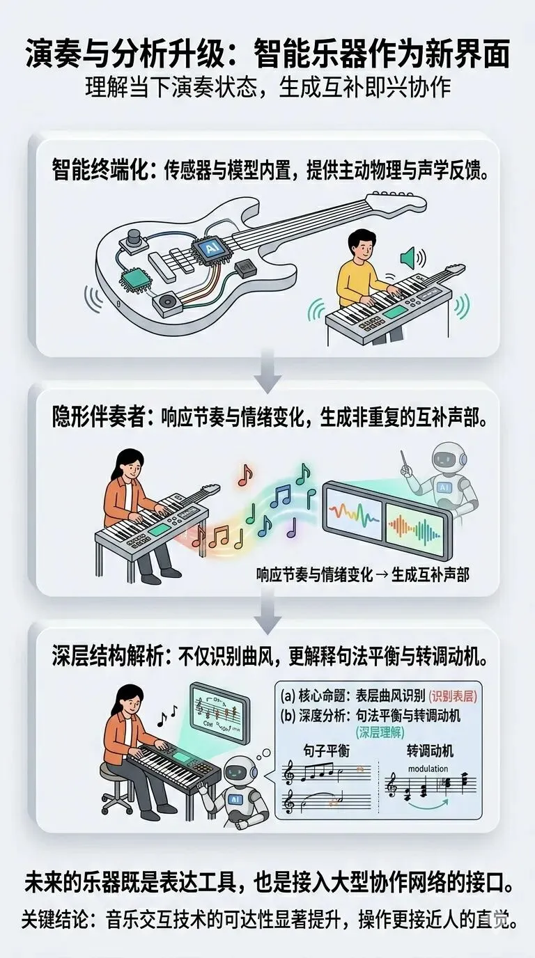 如果把视角再放大一步,智能乐器的意义还在于它为音乐交互提供了一种更直观的入口。很多人并不擅长使用复杂软件界面,但对按键、拨弦、敲击、滑动和身体动作非常敏感。当 Agent 被嵌入这些更自然的交互通道后,音乐技术的可达性会显著提升,创作与演奏也会更接近人的直觉。