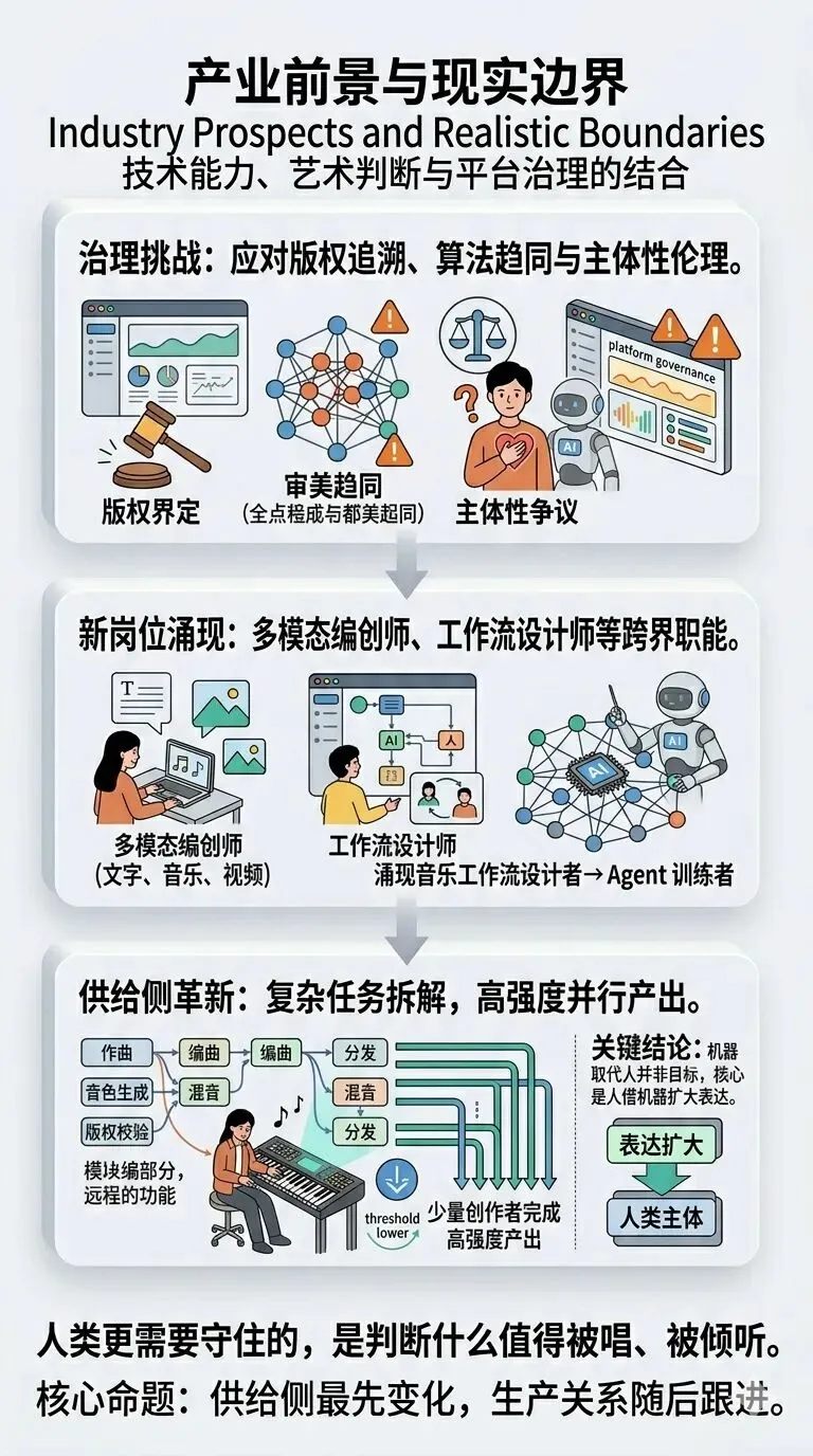 随着平台化生态逐渐形成,音乐产业中的新岗位也会更加多样。除了传统的作曲、编曲、录音和教学岗位,还会出现偏向系统设计与运营的新角色,例如智能音乐工作流设计者、定制化音乐 Agent 训练者、多模态音乐编创师、AI 乐器交互策划者、版权合规与风格溯源分析师等。未来竞争的关键,不只是“会不会做音乐”,而是“能不能把音乐能力与计算能力组织在一起”。