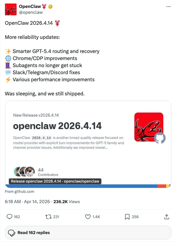 OpenClaw 2026.04.14 更新