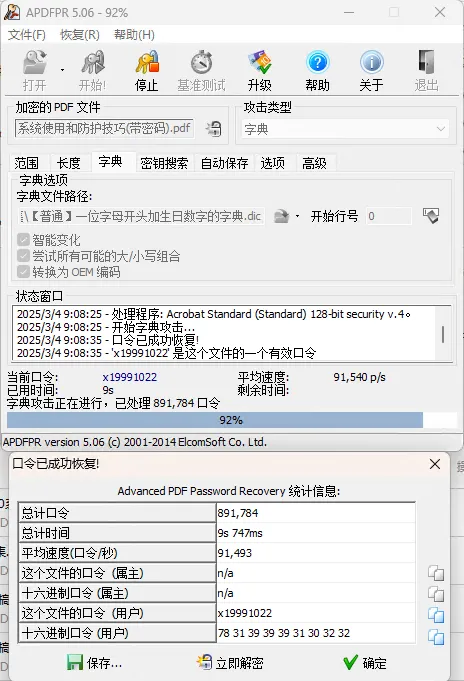 我先尝试了字典破解的方法。字典破解就是把可能的密码组合都列出来,让工具一个一个去试。这个方法虽然听起来有点笨,但是对于一些密码设置比较简单的文件来说,还挺管用的。比如说,有的人设置密码可能就用自己的生日、电话号码,或者一些简单的单词组合。像我有个朋友,他的 PDF 密码就是他的生日,用字典破解很快就找到了密码。如图所示显示:「当前口令:x19991022」