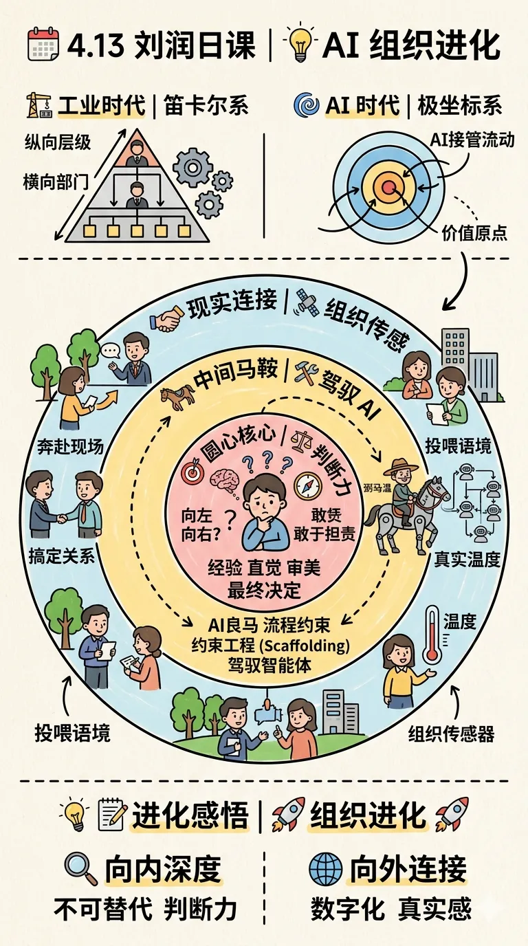 润总提出的这个视角太绝了!以前我们的组织像棋盘,每个人守着自己的格子,横向是部门,纵向是层级,这就是“笛卡尔坐标系”。但在AI时代,信息传递的成本几乎归零,那些靠“上传下达”生存的格子正在破碎。“极坐标系”的出现,意味着组织不再是刚性的层级,而是动态的涟漪。圆心是不可替代的决策灵魂,外圈是触碰现实的感知触角。这种转变背后是权力的重构:未来评价一个人的价值,不再看你管了多少人,而看你离决策圆心有多近,或者离真实客户有多近。这种结构性的进化,才是未来企业在AI浪潮中活下来的关键。
