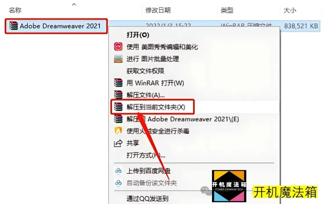 1.打开下载的DW2021软件安装包,鼠标右击压缩包选择【解压到当前文件夹】。