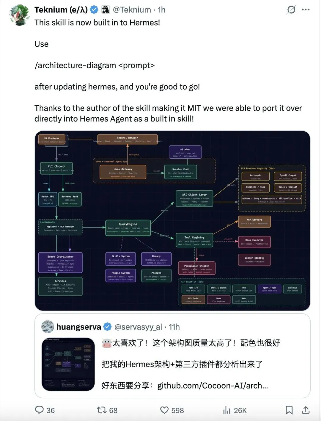 Teknium 在推文中写道:“这个技能现在已经内置到 Hermes 中了!只需使用 /architecture-diagram