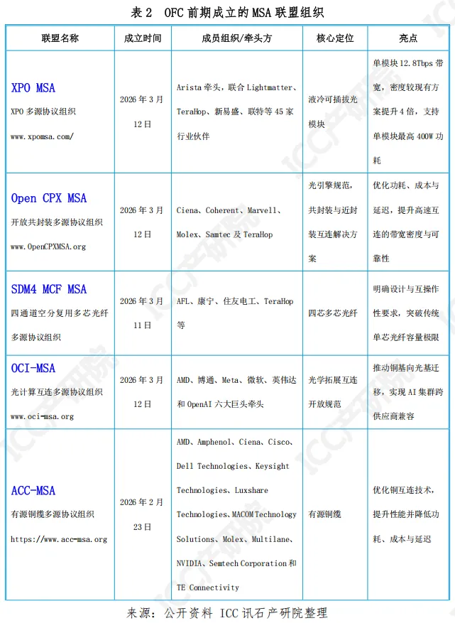 OFC 2026 前后,五大 MSA 联盟成立,覆盖 AI 互连全场景