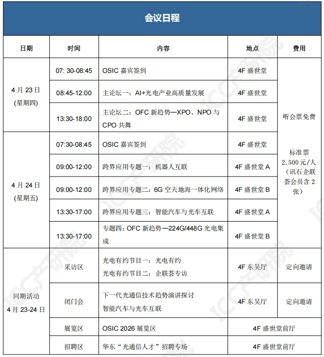 2026 年 4 月 23–24 日,ICC 讯石在中国苏州工业园区香格里拉大酒店重磅举办 OSIC 2026 第 3 届 AI+光电智联大会,以跨界融合智联未来为口号,聚焦 2026AI+光电产业创新机遇,内容深挖 OFC 新趋势、开拓光通信跨界新应用。