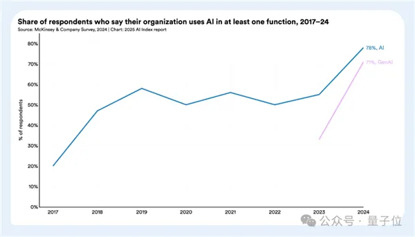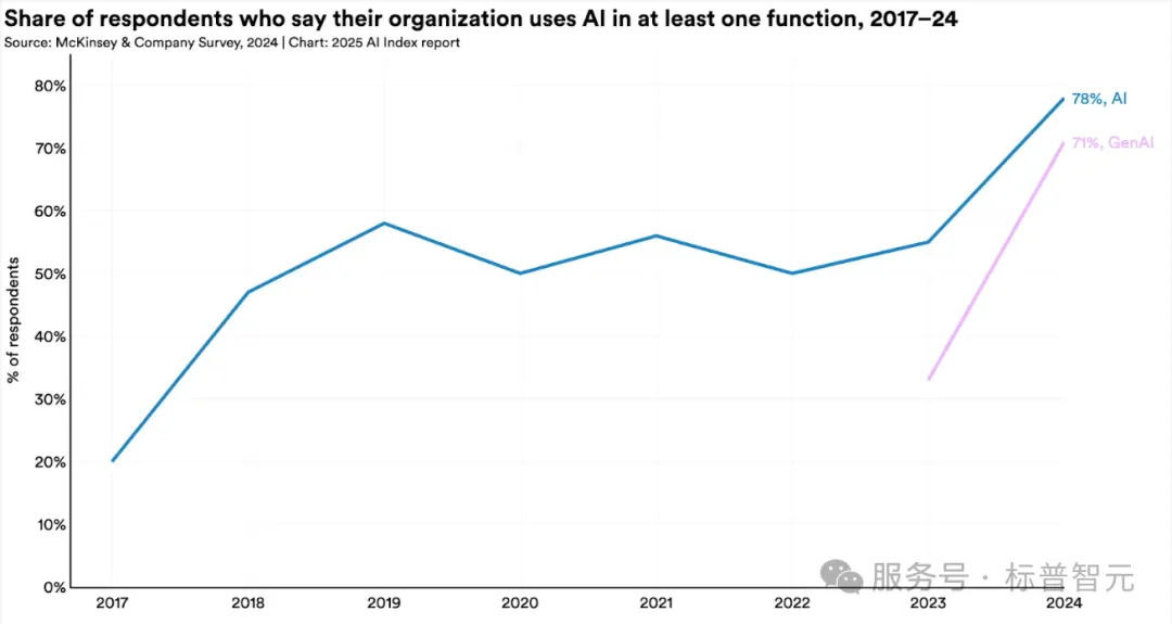 生成式AI在全球人口中的渗透率,三年内达到了53%。中国的职场AI使用率超过80%,高于全球平均水平。越来越多的企业在用AI工具承担过去需要人力完成的基础性工作,尤其是在文档处理、代码生成、客户服务等标准化程度高的岗位上。