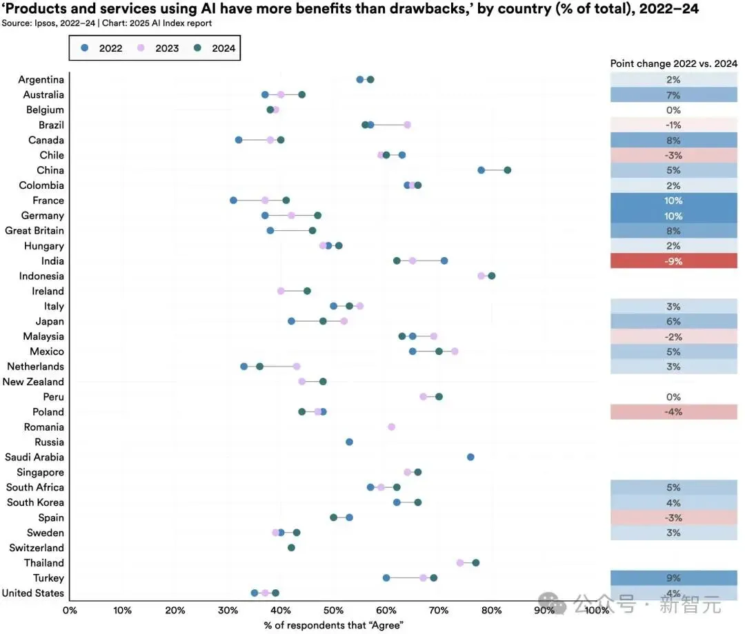 但报告同样指出,对AI改善工作前景持乐观态度的比例,美国(33%)明显低于全球平均水平(40%)。技术的扩散与社会的接受,从来不是同步的。