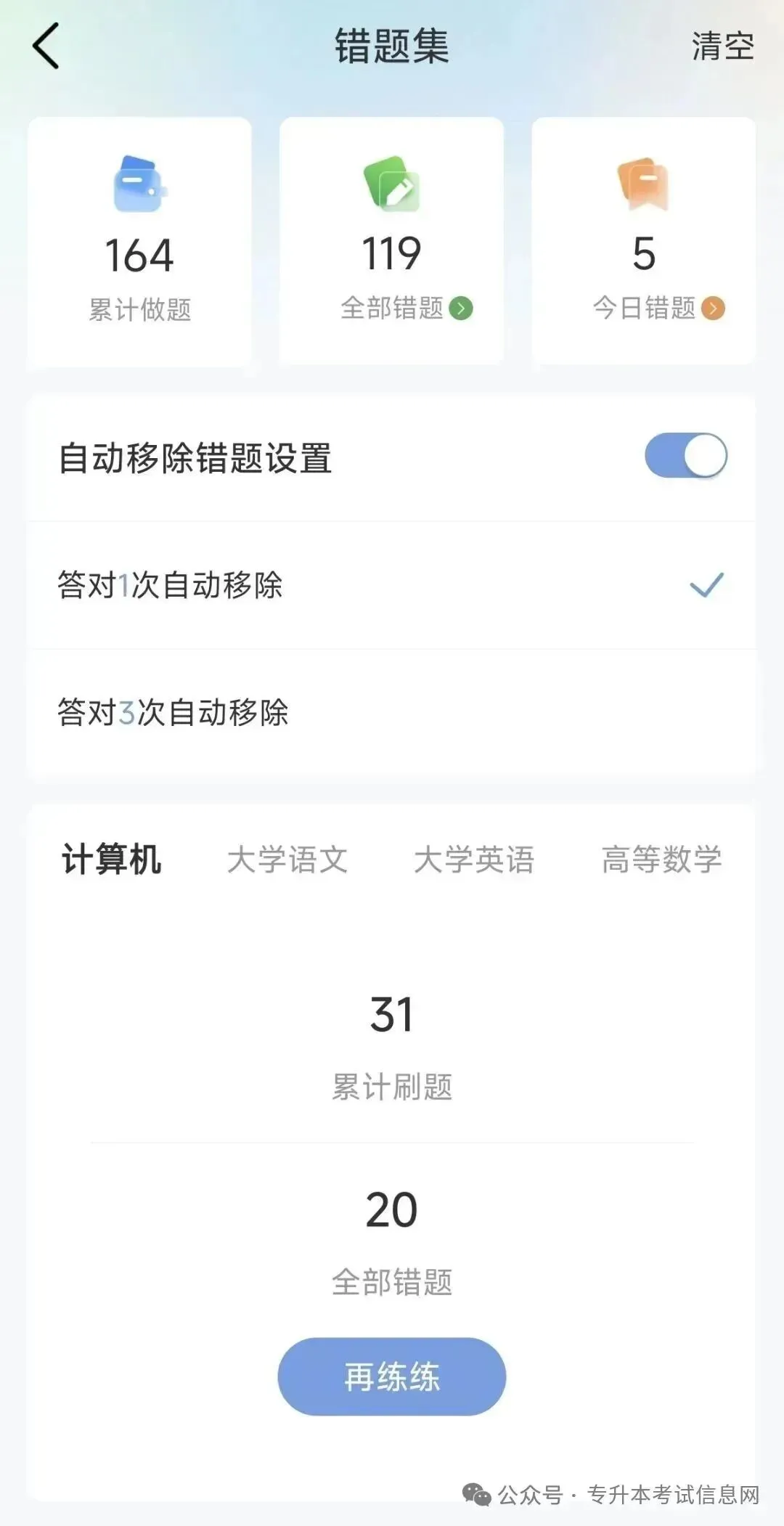随机刷题板块,可以分科目设置刷题数量,每天利用等车,排队,吃饭等碎片化时间,随时随地做题。