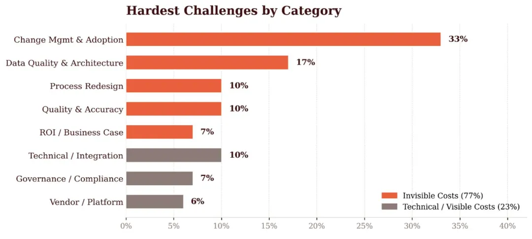 职能部门(法务、人力、风控)的阻力占 35%。终端用户 23%。中层管理 18%。 C 层 12%。