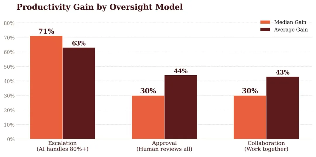 升级模式效果最好。但报告也坦承:这是"任务选择偏差"——能被设计成升级模式的,本身就是高重复、容错率高的任务。那些监管严格的场景,医疗文书、法律合规,该审的还是得审。