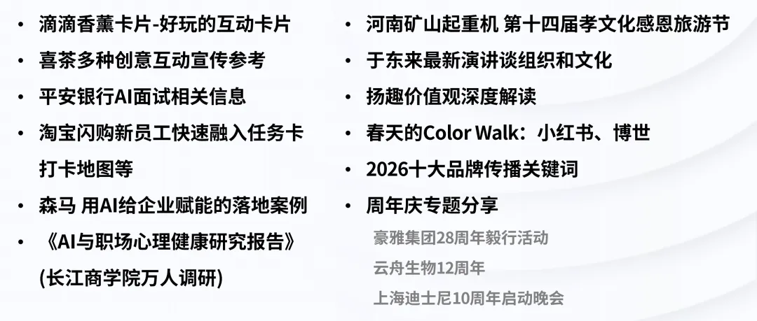 如今直播已更新至第17期,最近也重点为大家分享了许多各企业对AI的探索和实践案例,各类实用干货资料、近期的活动创意等等,一起来回顾一下吧👇