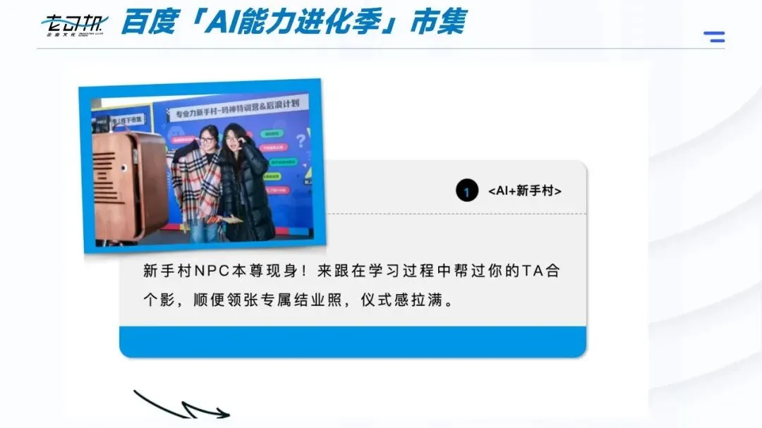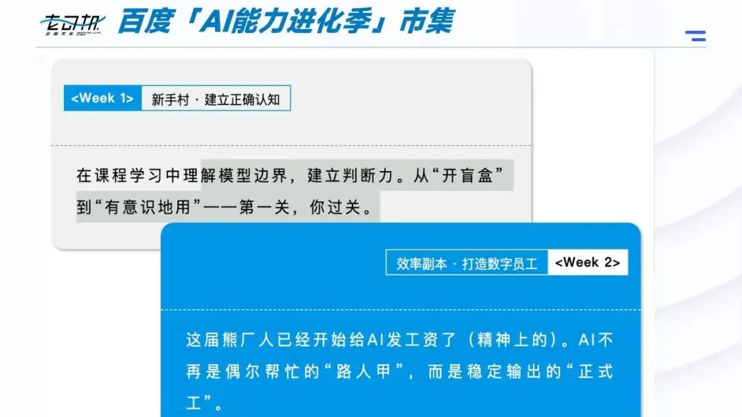 百度把全员AI学习包装成了线下市集:4周游戏化进阶(新手村→数字员工→人机协作→大模型应用),现场设了AI新手村、学习地图、社区组队、风向刊四个互动摊位,把“学AI”变成了一场好玩的文化活动。