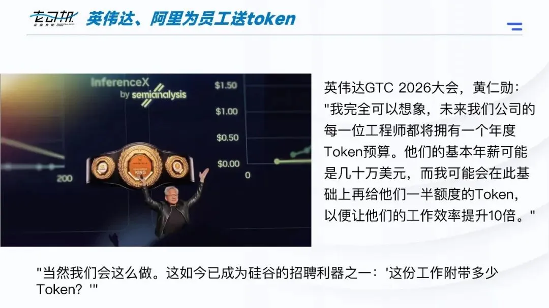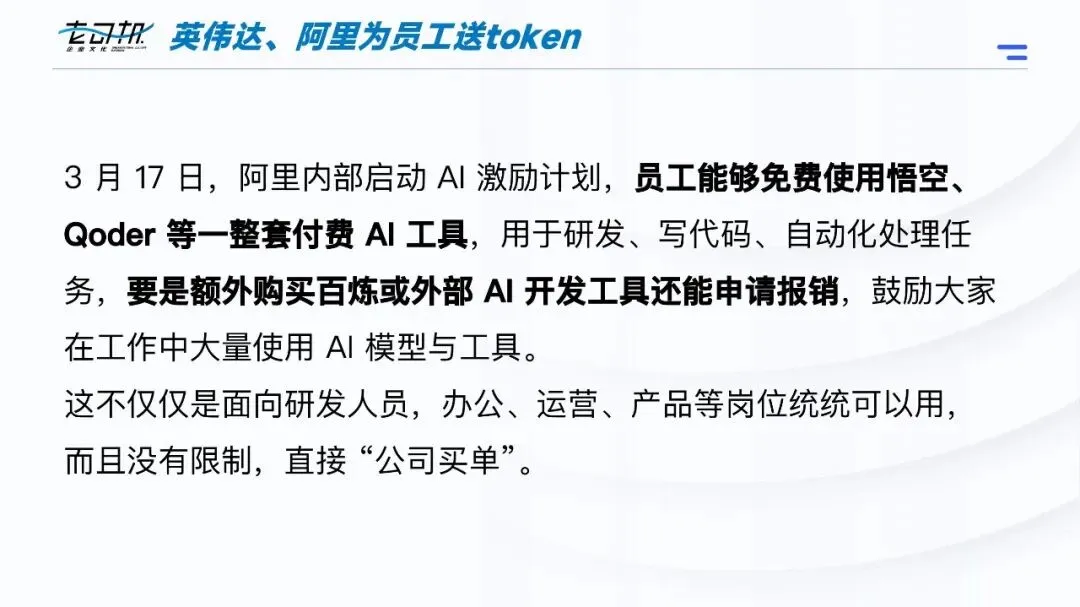 英伟达黄仁勋在GTC大会提出给工程师"年度Token预算",Token已成硅谷新招聘筹码;阿里启动全员AI激励——免费用全套AI工具,外部工具还能报销,同时成立ATH事业群整合五大AI业务线。两家巨头的动作放在一起看,能很清楚地感受到"Token即生产力"这个趋势。