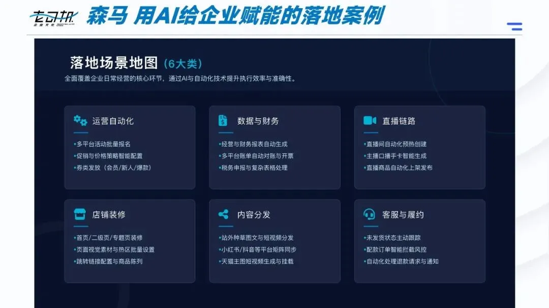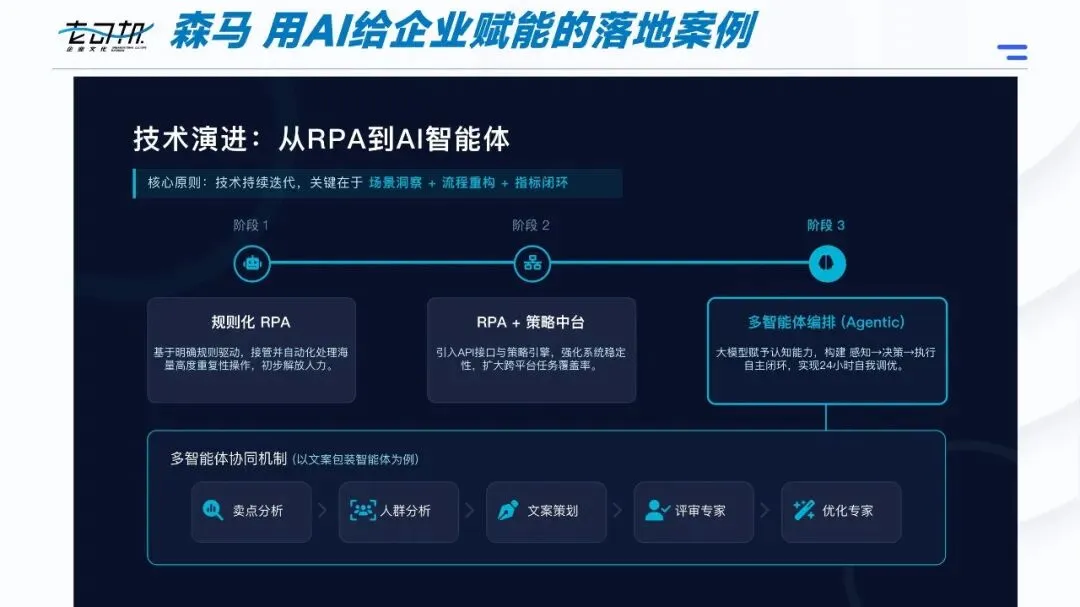 森马把AI自动化做成了"数字员工工位",覆盖店铺运营、直播、客服、财务等6大场景,技术路线已从RPA进化到多智能体编排(Agentic)。亮点是数据很硬:智能投流ROI提升10%、视觉生产降本70%-90%、RPA省了约60人/年、整体贡献GNV近亿,而且提出了一套"道法术器"落地方法论。
