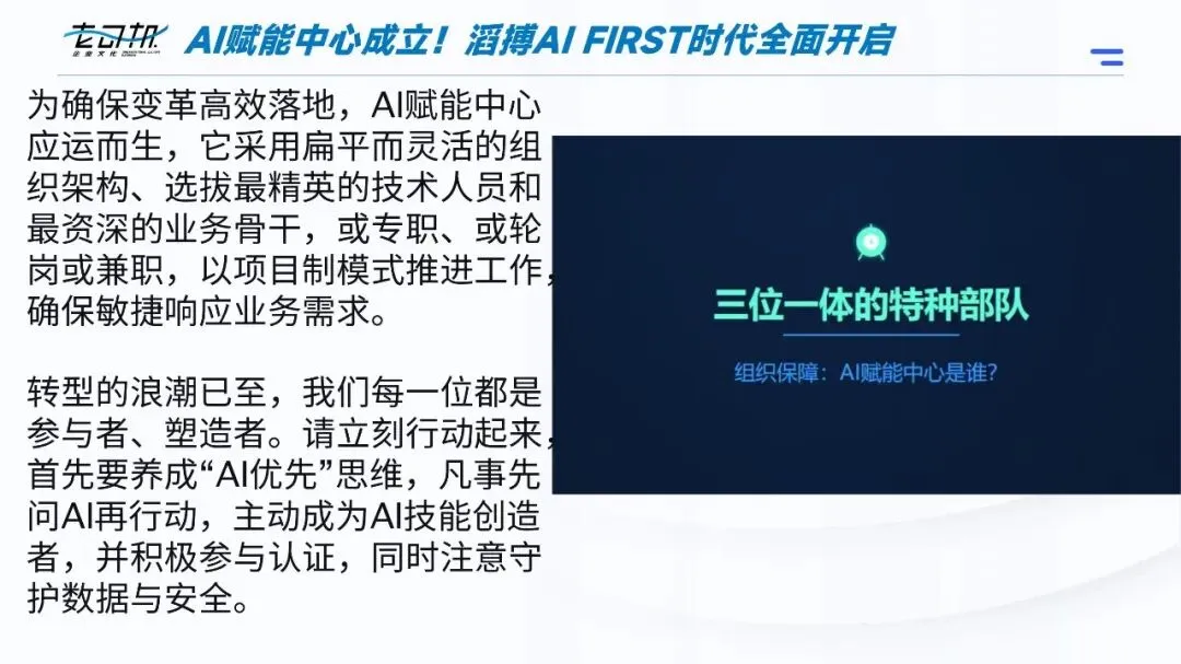 滔搏正式成立AI赋能中心,要求全员养成"AI优先"思维——凡事先问AI再行动。组织上走"精英技术+资深业务骨干"的项目制特种部队模式,通过内部直播发布,员工刷屏响应,是一个自上而下推全员AI转型的组织动员样本。