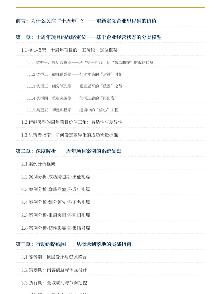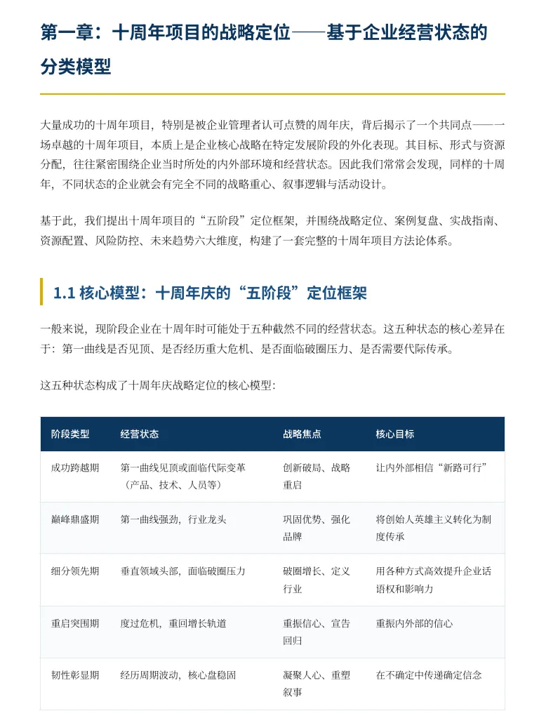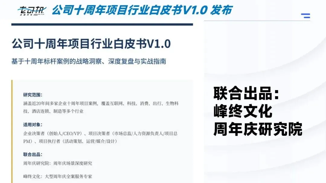 这份《公司十周年项目行业白皮书V1.0》由峰终文化和周年庆研究院联合出品,基于近20年间多家企业十周年项目的标杆案例做的战略洞察、深度复盘与实战指南。覆盖互联网、科技、消费、酒店连锁、制造等行业,做周年庆项目的同学可以当工具书用。