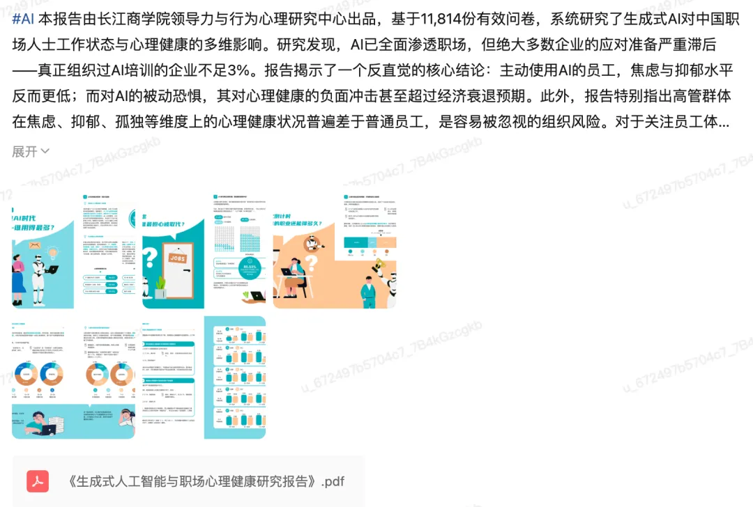 《AI与职场心理健康研究报告》长江商学院出品的万人调研报告,六个章节系统拆解:职业安全感与心理健康、高管vs员工谁更焦虑。做EAP、员工关怀、组织健康的同学强烈推荐,数据和框架都很完整。