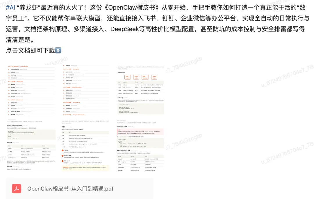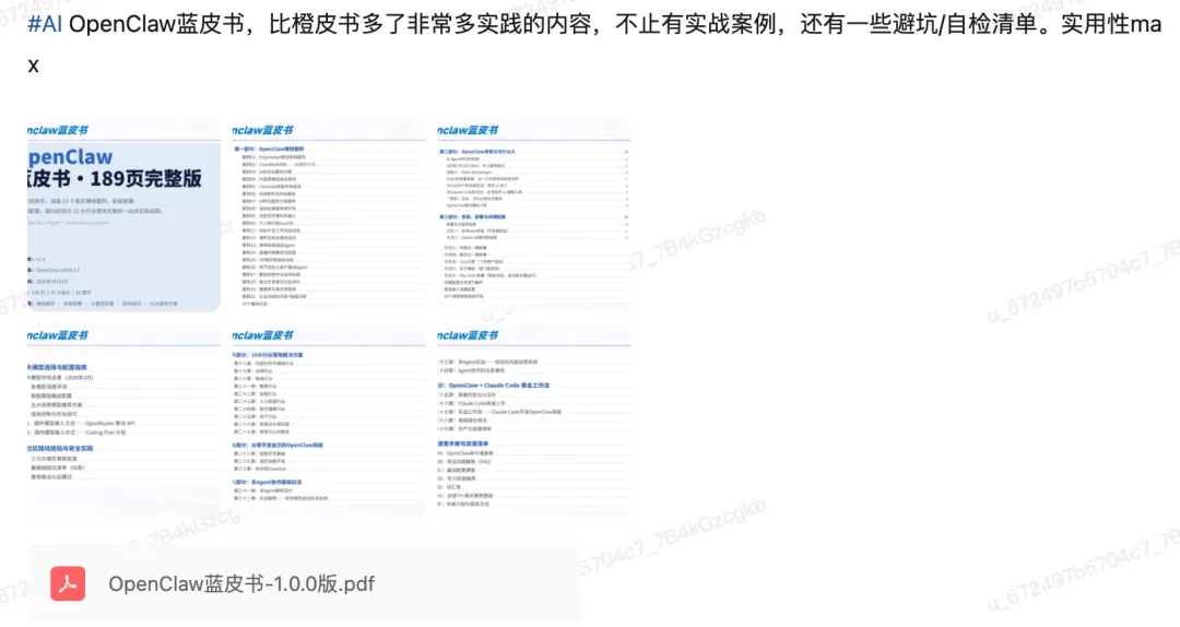 《OpenClaw橙皮书》OpenClaw的一站式参考手册,涵盖架构原理、部署方案、渠道接入、Skills系统、模型配置、安全与成本等内容。偏技术向,适合想了解AI Agent平台架构的同学。《OpenClaw蓝皮书》则更侧重于实践应用,通过案例进行拆解。