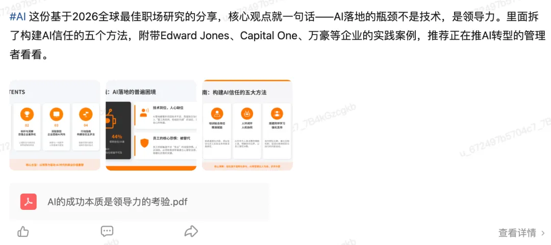 《基于2026全球最佳职场研究的洞察与实践》提出"AI的成功本质是领导力的考验",从战略引领、组织协同、人才赋能三个维度给出行动指南。做雇主品牌和职场文化的同学可以对标。