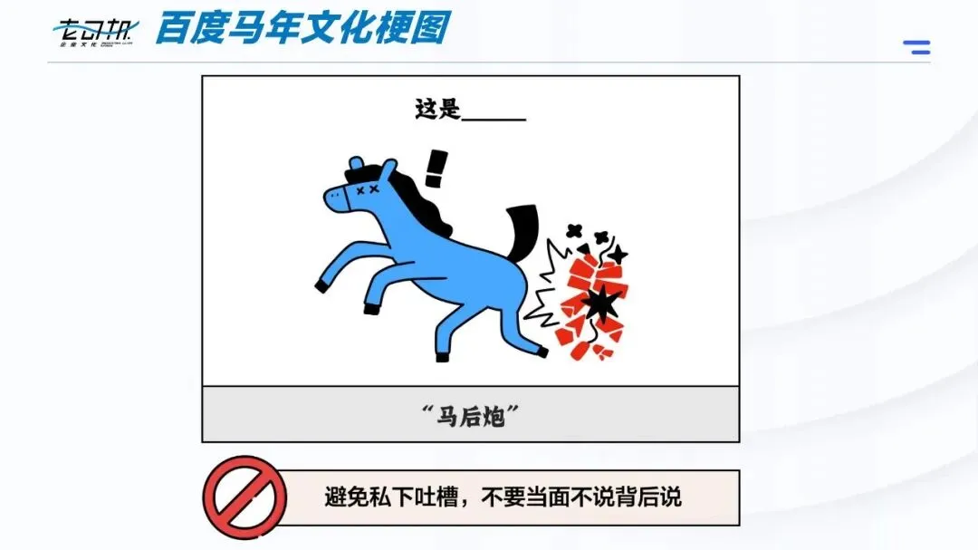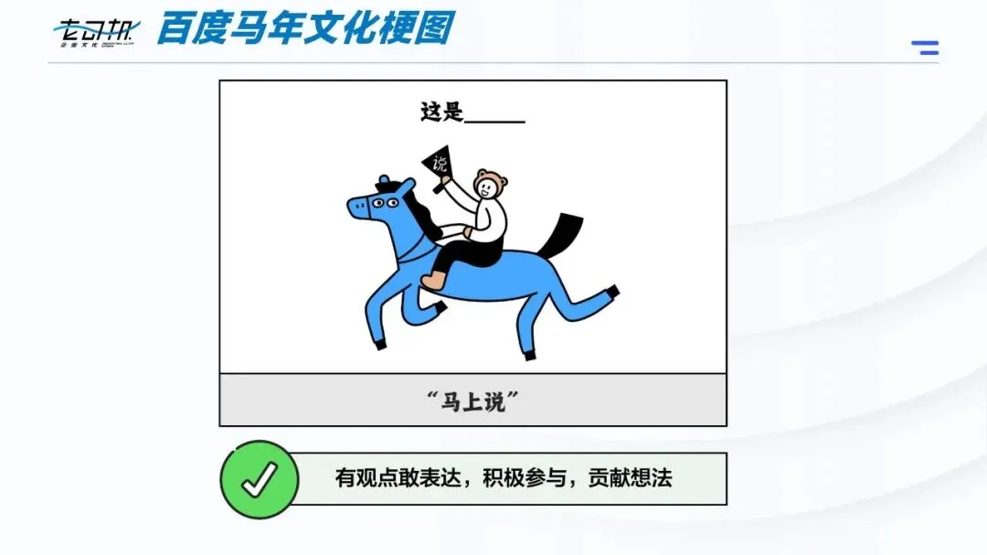 百度马年文化梗图,用"马"的成语谐音梗来传播企业价值观,比如"马上说"=有观点敢表达、积极参与、贡献想法(✅),"马后炮"=避免私下吐槽、不要当面不说背后说(🚫)。形式轻巧、传播性强,把价值观翻译成了大家愿意转发的梗图。