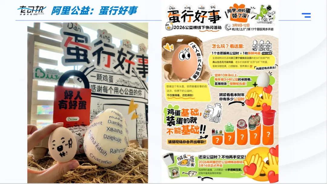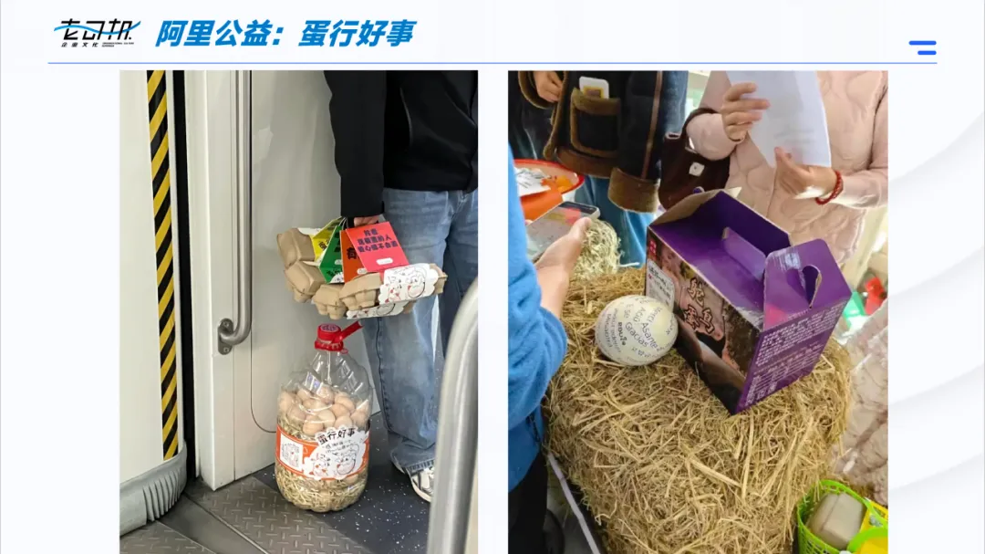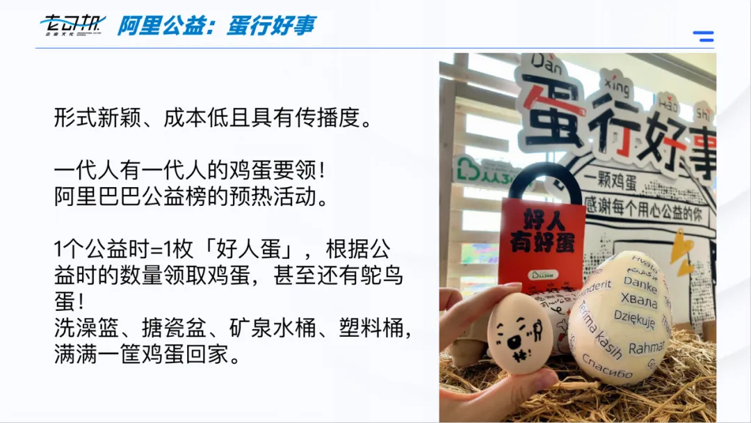 阿里公益:蛋行好事。阿里巴巴公益榜的预热活动,创意是"一代人有一代人的鸡蛋要领"——1个公益时换1枚"好人蛋",根据公益时数量领取鸡蛋,积攒够多的甚至能领鸵鸟蛋。员工们拎着洗澡篮、搪瓷盆、矿泉水桶满满一筐鸡蛋回家,场面既怀旧又有传播力。