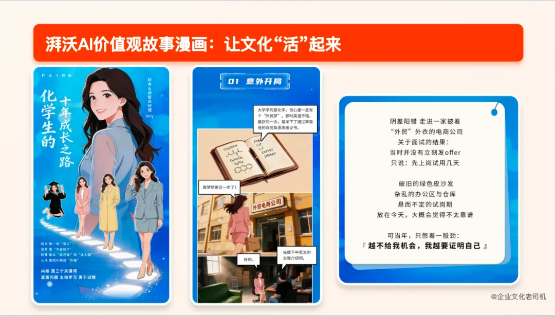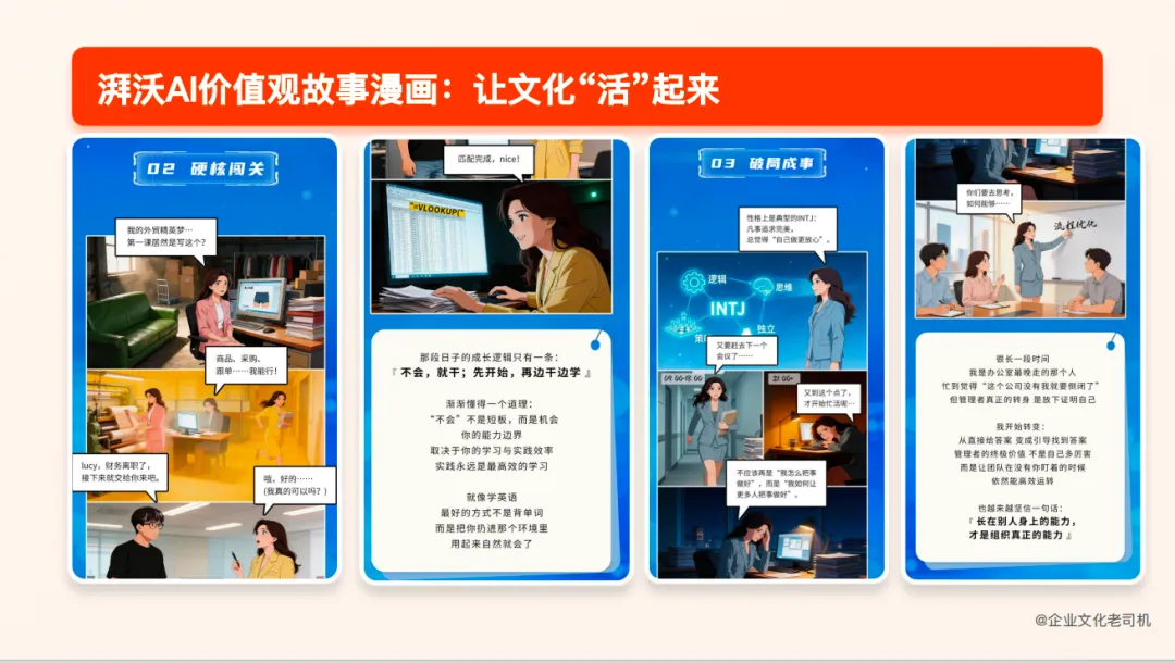 湃沃AI价值观故事漫画。湃沃用AI生成漫画来讲述真实员工的价值观故事,比如"化学生的十年成长之路"——把一个财务总经理从入职到成长的真实经历画成了漫画连载,通过AI降低了价值观漫画的制作成本。想用AI做价值观传播的同学,这是一个很具体的落地参考。