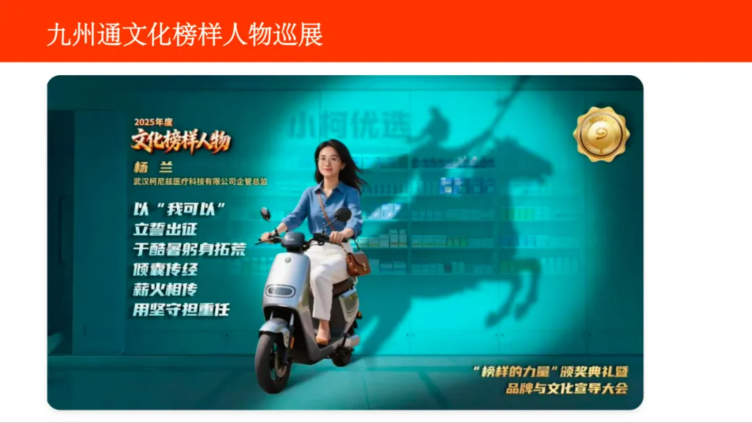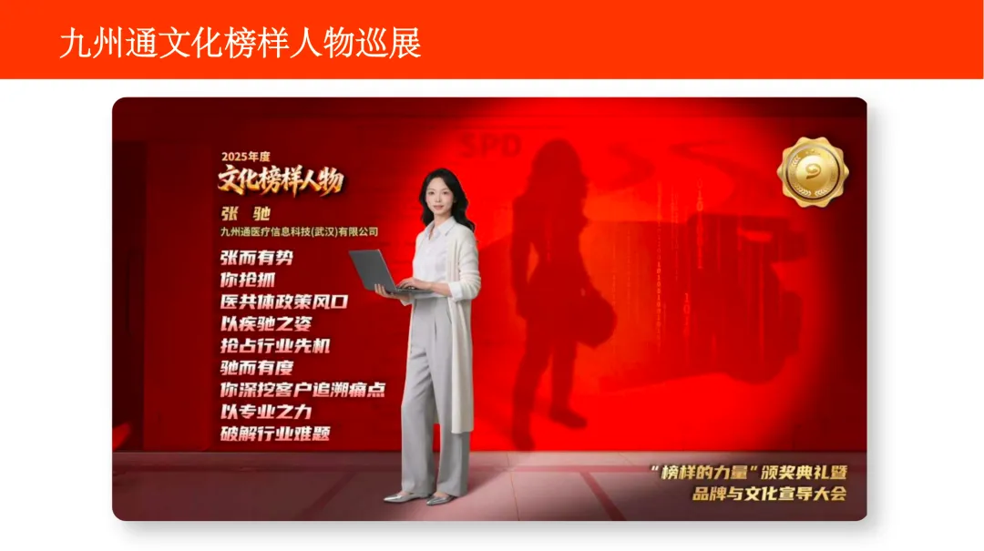 九州通文化榜样人物海报。结合获奖员工的名字和事迹,结合AI巧妙设计海报以及视频,如“张弛”飞驰人生,创意满满。适合做价值观故事、颁奖等参考。