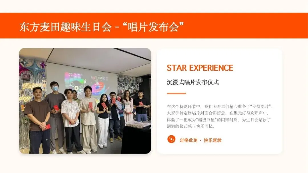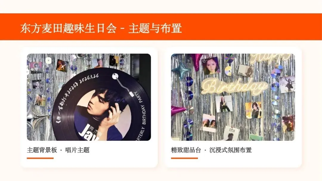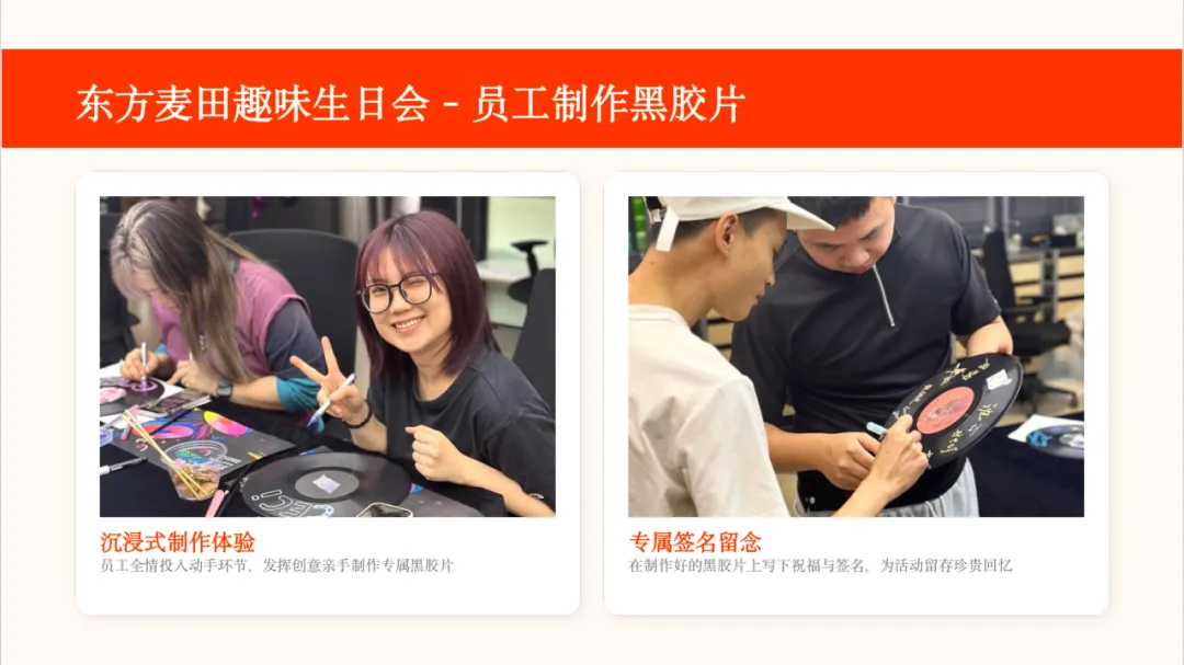 东方麦田趣味生日会。东方麦田把季度生日会做成了一场沉浸式"唱片发布会"——用黑胶唱片做主题背景板,精致甜品台走演唱会氛围布置,为每位寿星定制"专属唱片封面"合影,还有"2026黑胶片DIY"手作环节。做员工生日会想出新花样的同学推荐看这个案例,把生日会做成了一场"小型演唱会体验"。