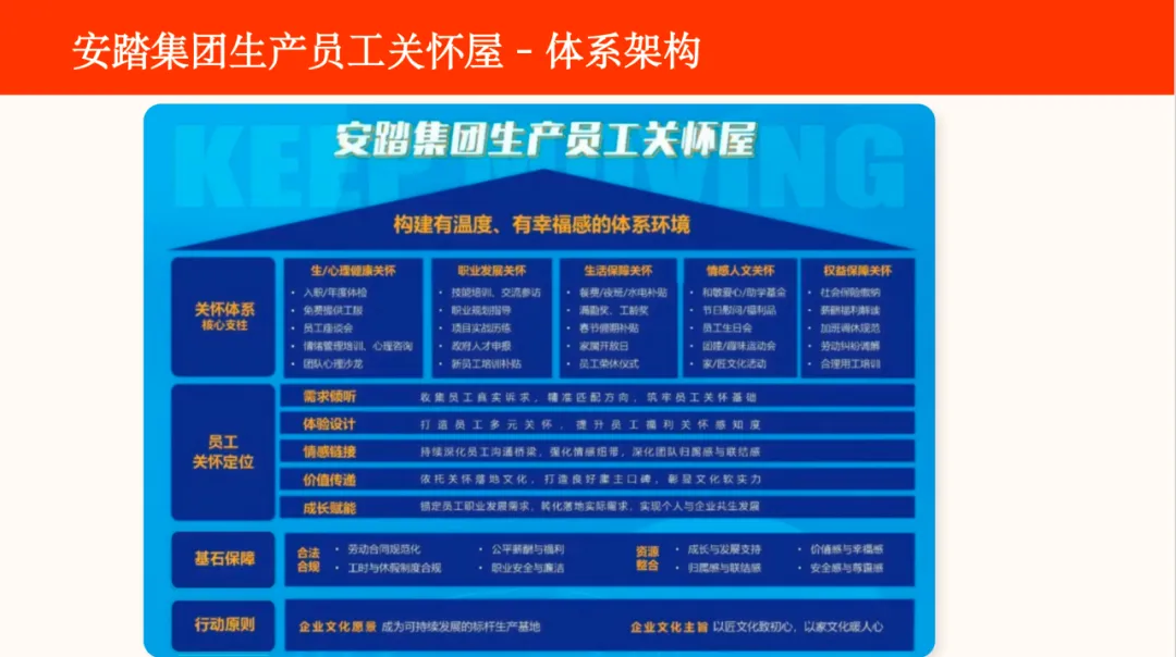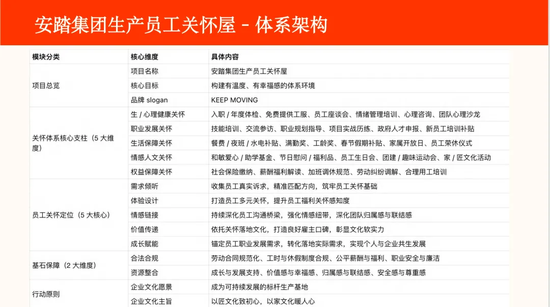 安踏集团生产员工关怀屋体系。把过往分散的福利举措整合成一个体系化产品,通过"关怀屋"让每一份投入都能被清晰知晓、可触摸、可信赖。做蓝领/生产员工关怀、想把福利体系从"撒胡椒面"升级成"产品化呈现"的同学值得看看安踏的思路。