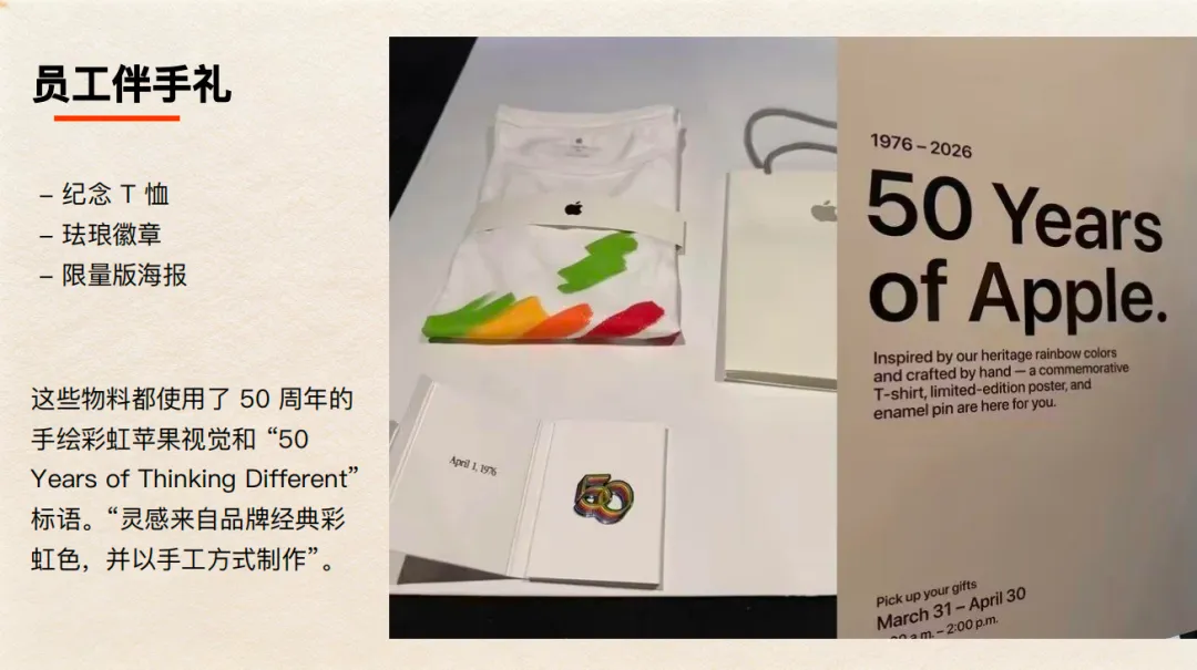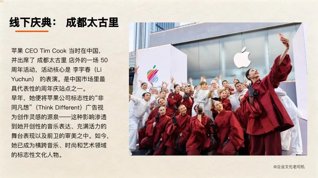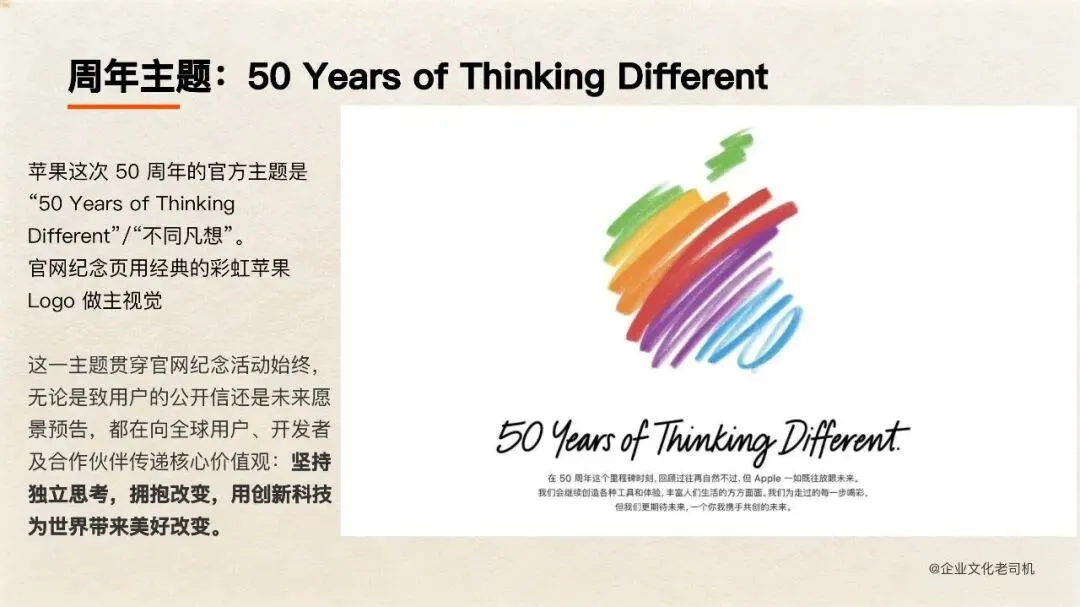 苹果50周年庆「50 Years of Thinking Different」。主题"50 Years of Thinking Different"贯穿始终,核心语气不是怀旧展,而是"回望50年,继续面向未来"。CEO公开信用经典的"致那些疯狂的人"收尾,官网用彩虹苹果Logo做主视觉。做大型周年庆主题策划的同学可以看看苹果怎么在全球范围内统一调性、分层落地的。