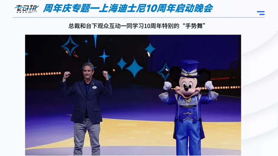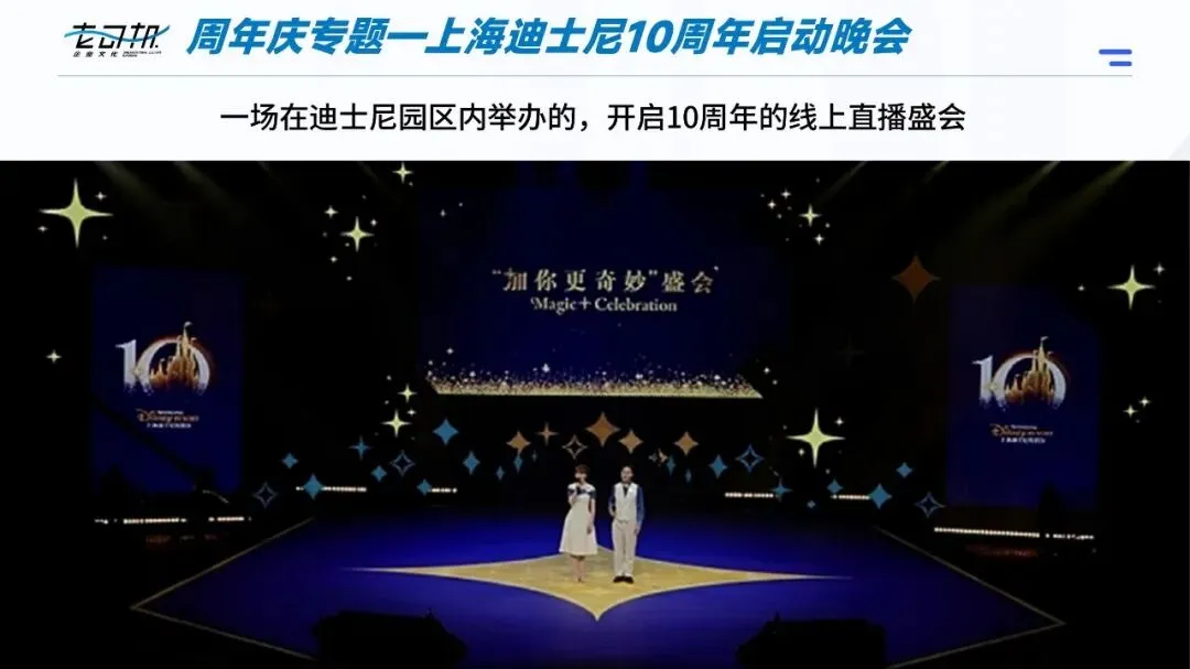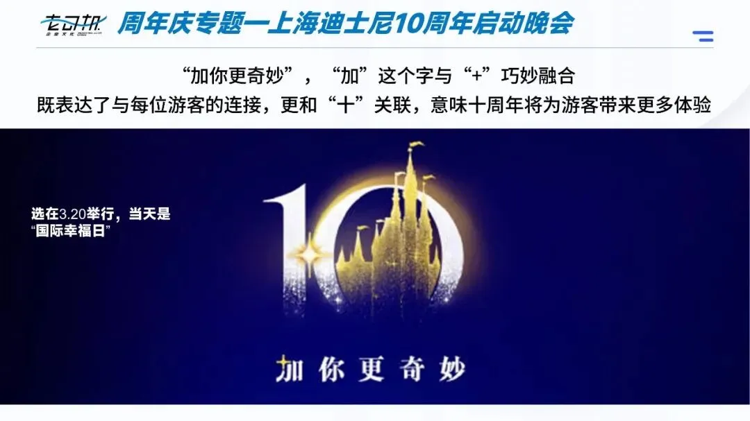 上海迪士尼10周年启动晚会「加你更奇妙」。主题"加你更奇妙"把"加"字和"+"巧妙融合,既表达与游客的连接,又关联"十"。选在3月20日"国际幸福日"举行,通过线上直播启动。现场有总裁互动学手势舞、幕后工作者致敬视频、"许愿星"升起仪式等环节,园区整体焕新布置,仪式设计和情感节奏都很讲究。
