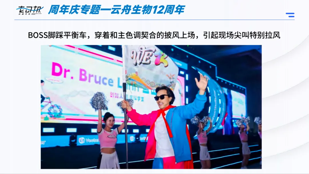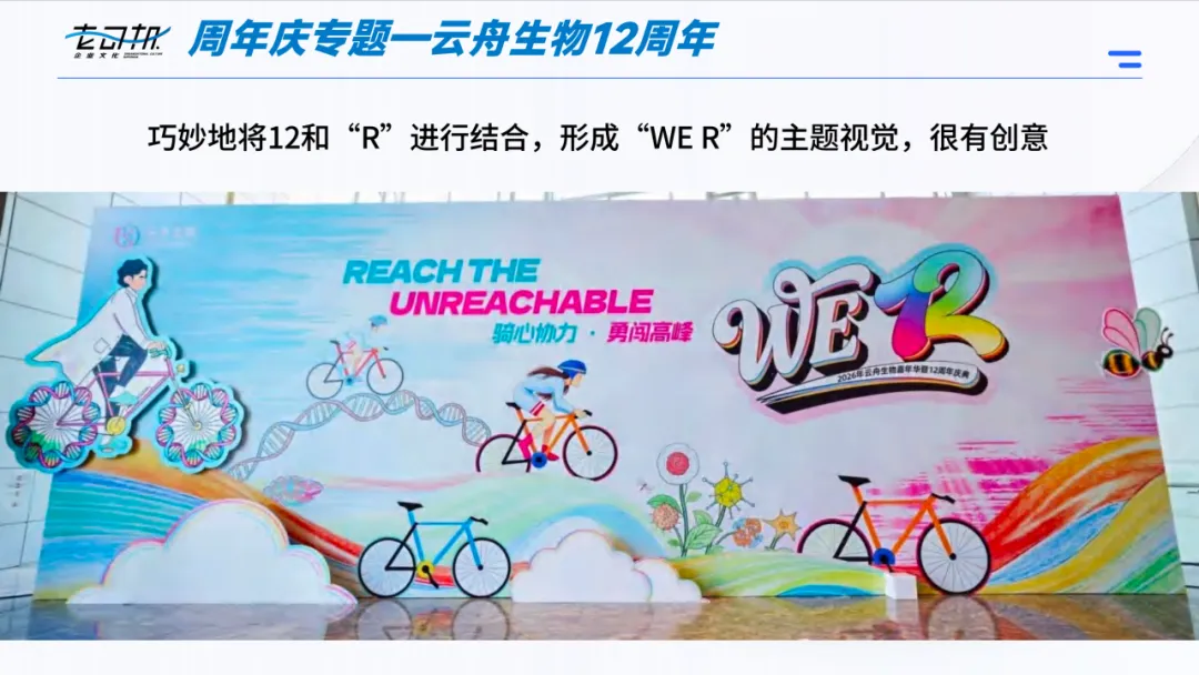 云舟生物12周年「WE R · Reach the Unreachable」。生物科技公司的周年庆,亮点在视觉创意:巧妙地将12和"R"结合,形成"WE R"的主题视觉,配合自行车骑行元素和DNA双螺旋插画。把行业属性融进了周年庆的视觉语言里,不落俗套。