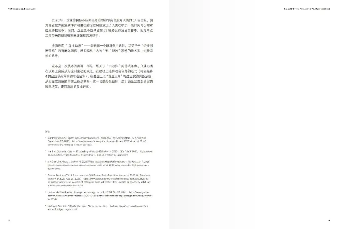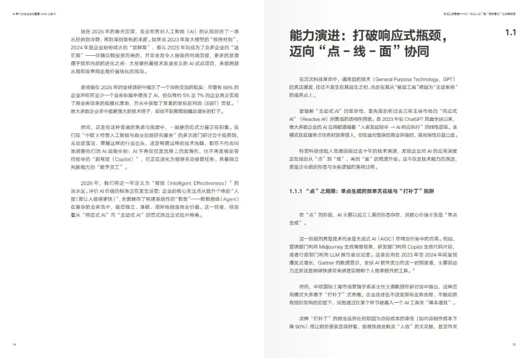人工智能已从响应式辅助工具迈向主动智能新阶段,企业竞争核心从单点工具应用转向系统智效构建。AI不再局限于提升个体效率,而是嵌入业务流程、参与决策判断、接管任务闭环,成为企业运行的核心组成部分。当前企业普遍面临AI试点多、规模化落地难的困境,核心瓶颈在于旧流程、旧组织与新智能能力不匹配,难以将零散试验转化为稳定价值闭环。 本白皮书立足主动智能范式,重新定义企业AI成熟度层级,构建3×3战略矩阵,拆解从单点人效到系统智效的跃迁路径。结合玛氏、森马、安克创新、美的、施耐德电气等多行业标杆实践,阐述企业如何构建判断系统、推进智能体协同、重构组织与流程,实现降本增效、驱动增长与模式创新。同时展望多智能体协作、世界模型等技术前沿,提出自驱型组织与可信AI治理框架,为企业在AI时代完成战略跃迁、构建长期竞争力提供系统性参考。