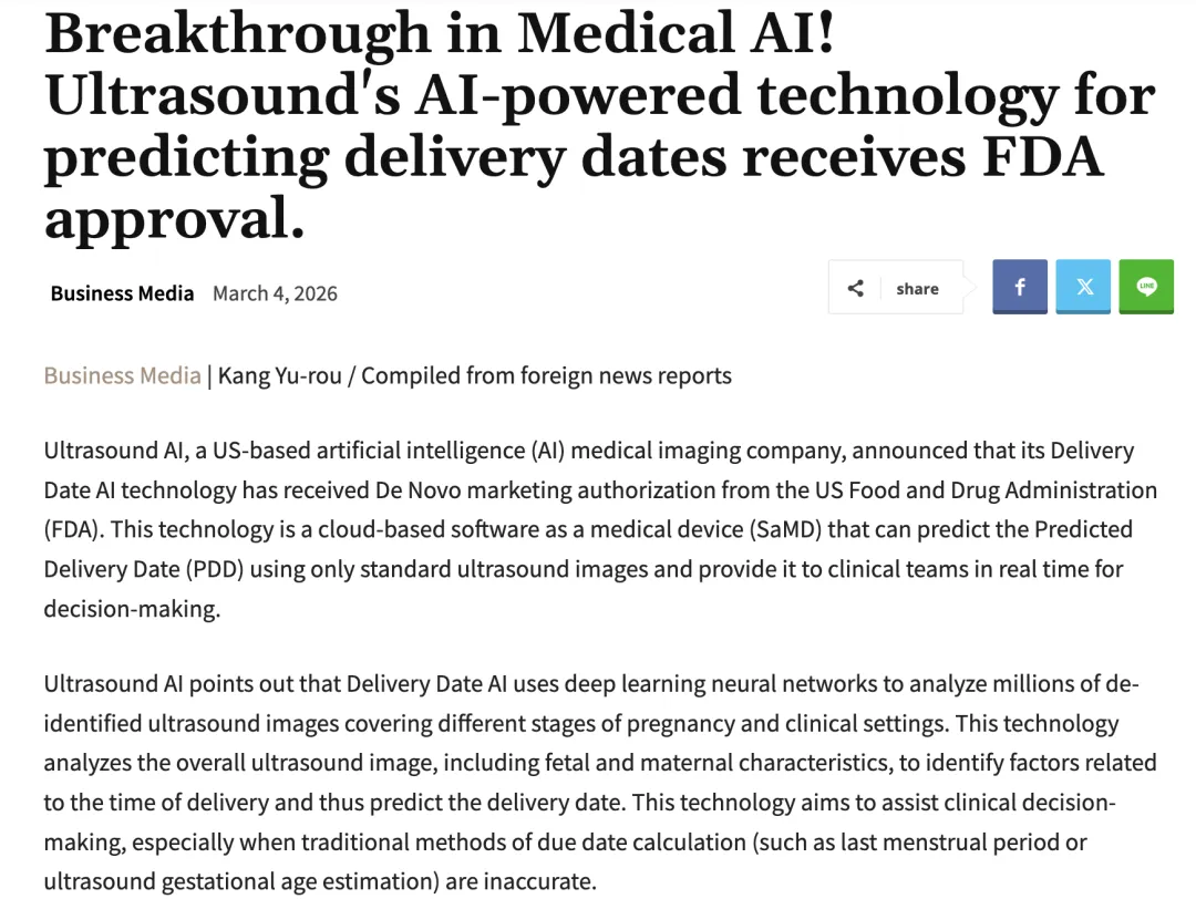 2026年3月,美国FDA通过De Novo路径,正式批准了一款基于超声影像的AI分娩日期预测系统[1]。