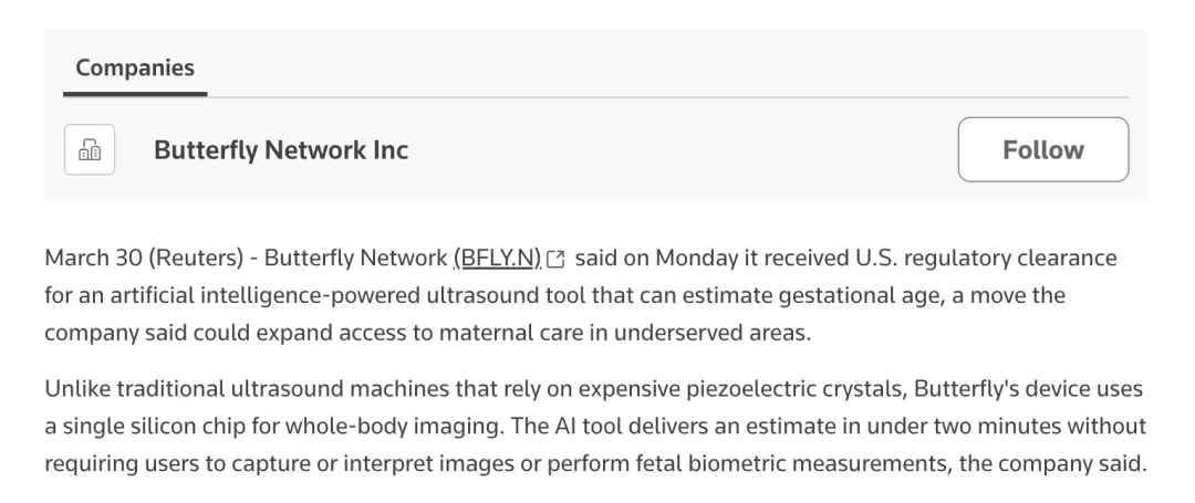 [2]https://www.reuters.com/business/healthcare-pharmaceuticals/butterfly-network-gets-fda-clearance-ai-ultrasound-pregnancy-tool-2026-03-30/?utm_source=chatgpt.com.