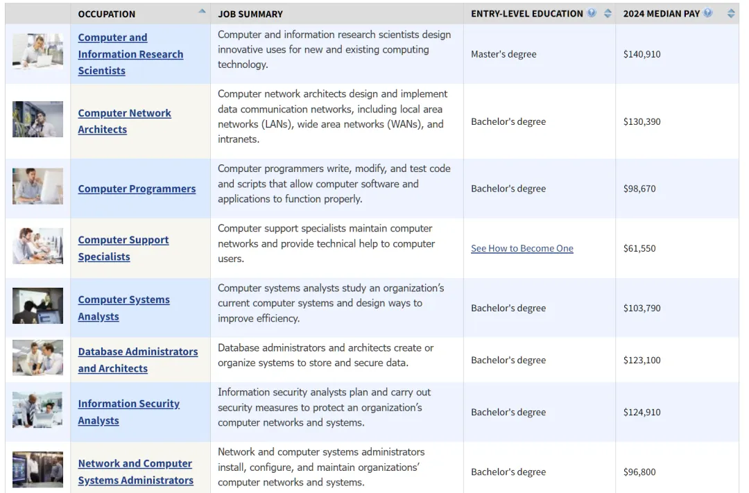 更重要的是,所谓“美国大厂开始招高中生”的说法,并没有被主流公开数据支持。恰恰相反,美国劳工统计局(U.S. Bureau of Labor Statistics)对高增长、高薪职业的统计显示,大量核心岗位依然需要本科及以上学历。例如: