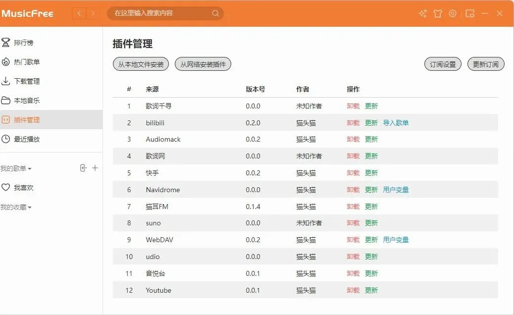 点击更新订阅后要加载1到2分钟(到了两分钟如果还在加载,直接退出软件,再进入也能看到导入的音源),加载成功后导入的音乐可以在插件管理页面看到