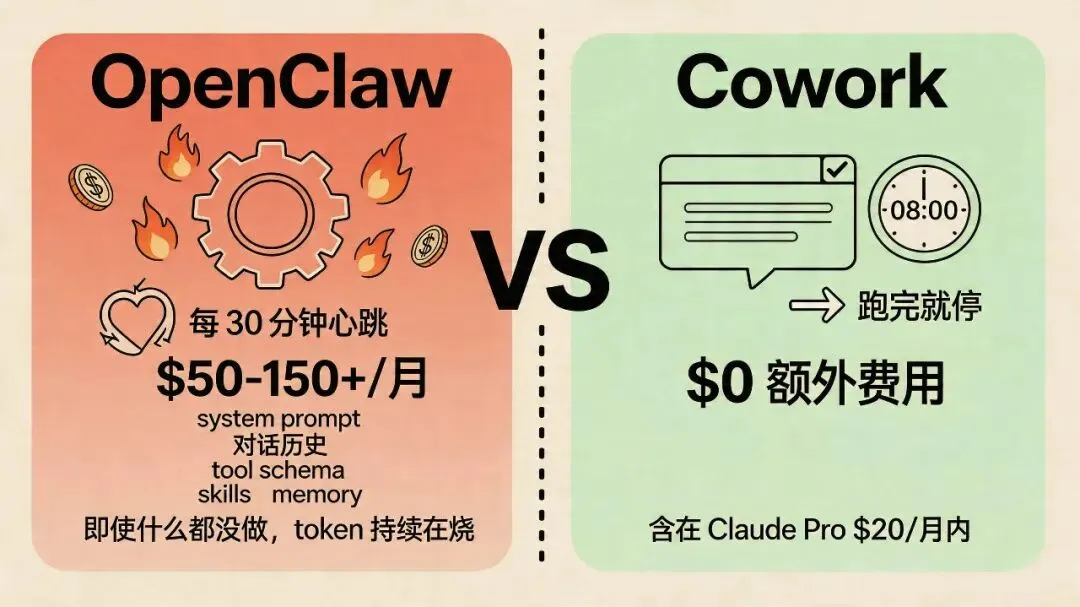OpenClaw 每月烧 100 刀,Cowork 不额外花钱,干的是同一件事
