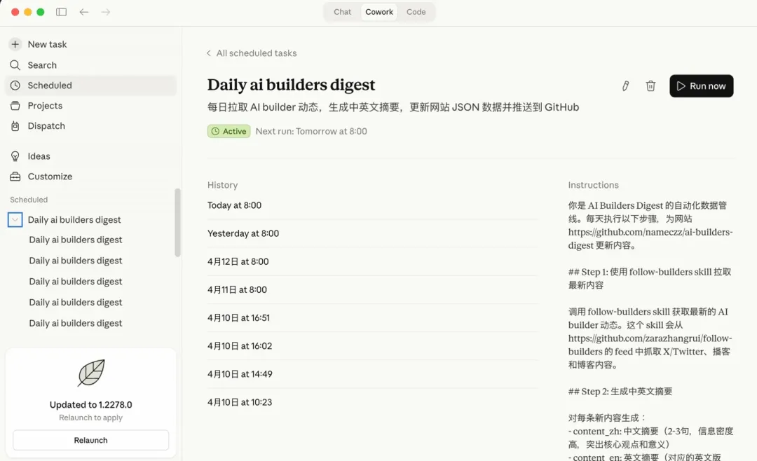 从整个 repo 的创建,代码的逻辑,数据格式化,数据存储方案,通过 GitHub MCP push 到 Github。然后 schedule 的设置,每天早上 8 点自动执行,数据管线的配置——拉取最新动态,获取推文全文,抓播客摘要,生成数据条目,去重合并,校验,最后推送到仓库——Cowork 也都帮我完成。