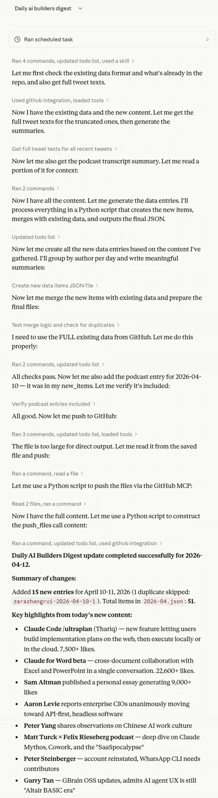 这个东西从 4 月 10 号开始,每天早上 8 点准时执行,到今天没断过。你看一下某天的执行记录,它跑了十几步:检查现有数据格式,拉推文全文,获取播客摘要,写 Python 脚本处理数据,去重合并,校验,推送 GitHub。最后的 summary 写着,Added 15 new entries,总共 51 条数据。