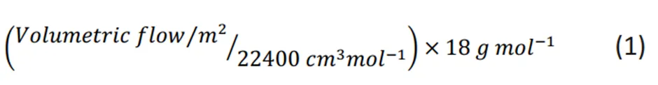 为了比较PET和Kapton膜的水渗透性,实验在130℃下进行,绝对湿度恒定为21.9 g m⁻³。为了观察PET、铝涂层PET和Kapton薄膜的温度变化,实验在25°C至110°C的温度范围内重复进行。在适当情况下,湿度渗透率以水蒸气透过率(g·m⁻²·day⁻¹)表示。该水蒸气透过率使用MPA的进气口和出气口湿度探头计算得出。渗透侧水的流量(摩尔分数与吹扫气体流量的乘积)除以膜的有效面积,得到单位面积的体积流量(cm³·m⁻²·day⁻¹)。体积流量除以气体的摩尔体积,再乘以水的摩尔质量,即可转换为摩尔流量,如公式1所示: