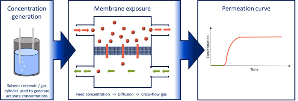 所有实验均使用英国SMS公司生产的横流式膜渗透仪MPA Horizon进行。在样品暴露前,操作人员选择所需的气体或蒸气分子浓度和温度,并通过检测器进行监测。MPA的原理是将所需溶剂/水蒸气或气体浓度的气体以可控流速,在惰性载气中流过膜表面。实验过程中样品的一侧始终处于上述条件下,检测器用于测量穿过膜进入横流气体的渗透分子。检测器能够准确识别和量化横流气体中的渗透物质,从而生成渗透曲线。图1展示了MPA的原理示意图。