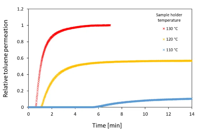 下一项研究考察了甲苯在PET中的渗透情况。图4显示了浓度约为35,000ppm的甲苯(25℃时为95%甲苯)在110℃、120℃和130℃下通过PET膜的渗透曲线。甲苯的存在可以与PET基体相互作用,可能起到增塑剂的作用。因此会发生物理变化,使得更多的甲苯分子能够扩散到材料中。甲苯扩散到PET材料中的扩散活化能较高,这意味着需要更高的温度才能克服该活化能并观察到渗透现象。在高于其玻璃化转变温度(Tg,>70℃)时,110℃下该相互作用的动力学较慢,并随着温度的升高而增加,在130℃时渗透显著。