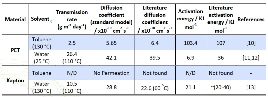 在MPA中,WVTR的测量范围为0.009 - 800 g·m⁻² ·day⁻¹,利用在线湿度探头提供动力学和平衡数据。为了研究PET对甲苯的渗透性随温度的变化,在高于其玻璃化转变温度(Tg)的110°C、120°C和130°C下进行了进一步实验,并将甲苯浓度保持在35000ppm(相当于95%p/p₀,25°C)。水和甲苯的扩散系数采用Crank提出的平板模型(4.23)中的公式2计算[7]。