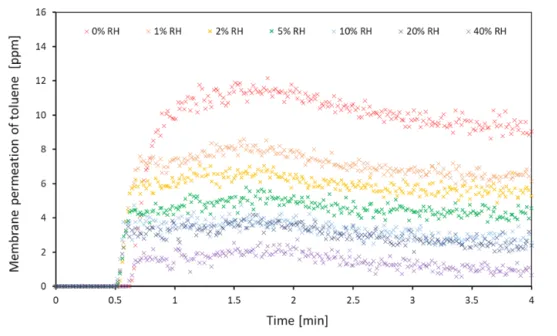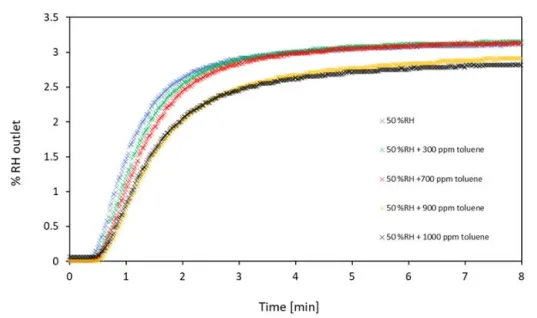 我们还进行了反向研究,通过改变相对湿度(RH)并保持甲苯浓度恒定。图6显示环境湿度的增加会限制甲苯的渗透。这可能是由于水分子占据或阻塞了甲苯原本可以利用的渗透路径。