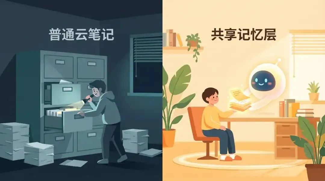 普通云笔记更像档案柜,这个系统更像共享记忆层。