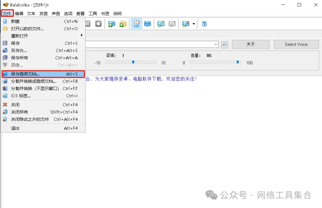 2、接下来,调试完成了,就点击balabolka菜单栏“文件”中的“保存音频文档”。