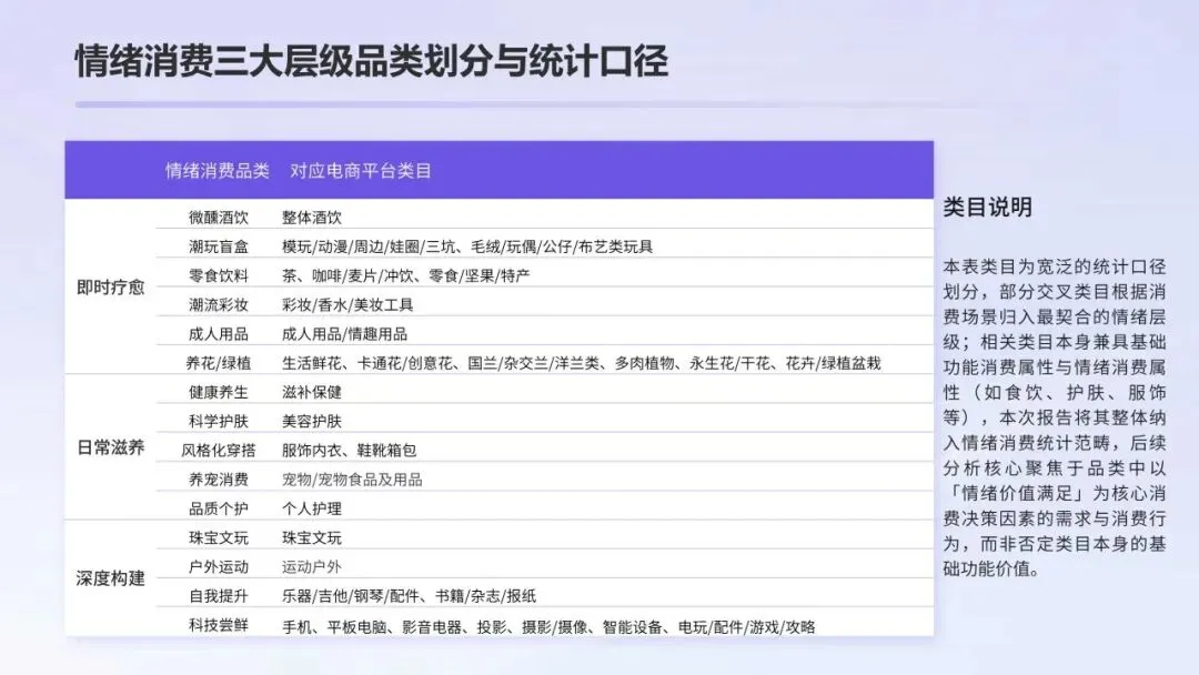 即时疗愈类情绪消费:快速情绪满足和社交货币,涵盖品类:零食饮料、微醺酒饮、潮玩盲盒、潮流彩妆、鲜花绿植成人用品