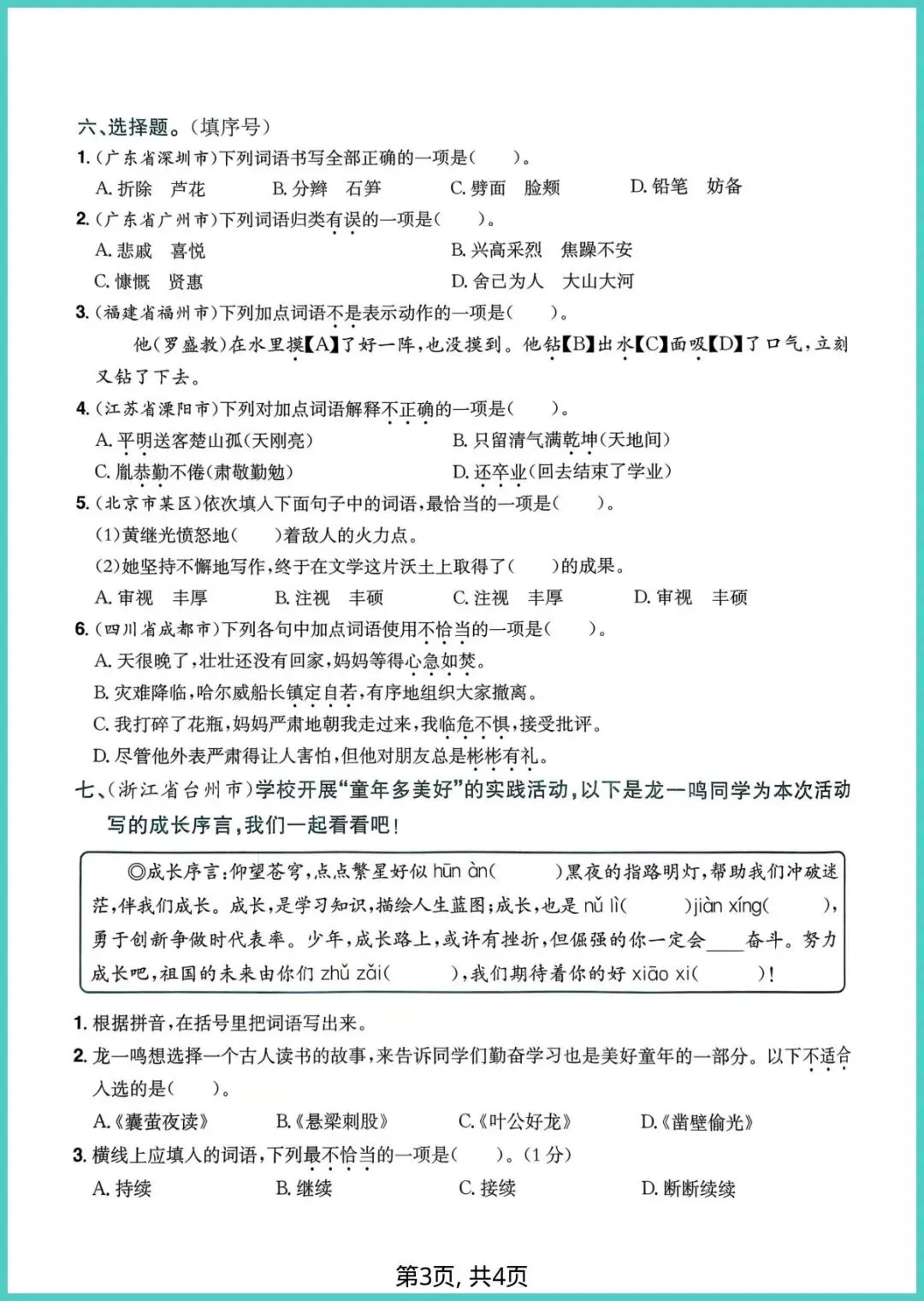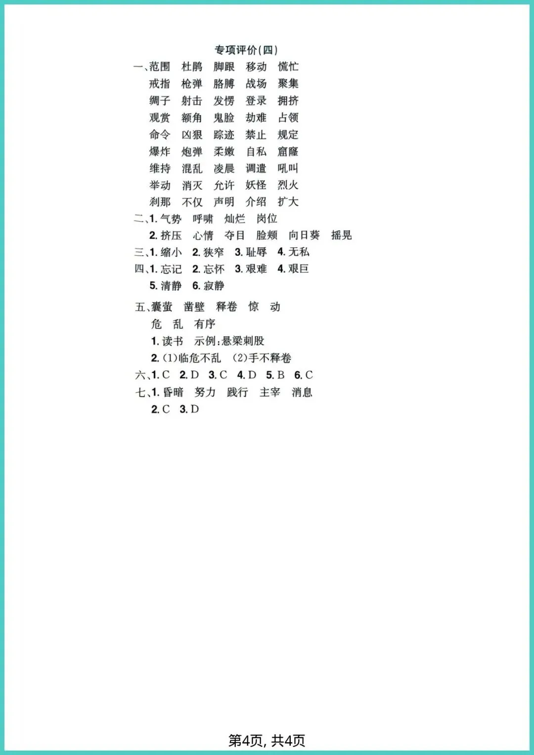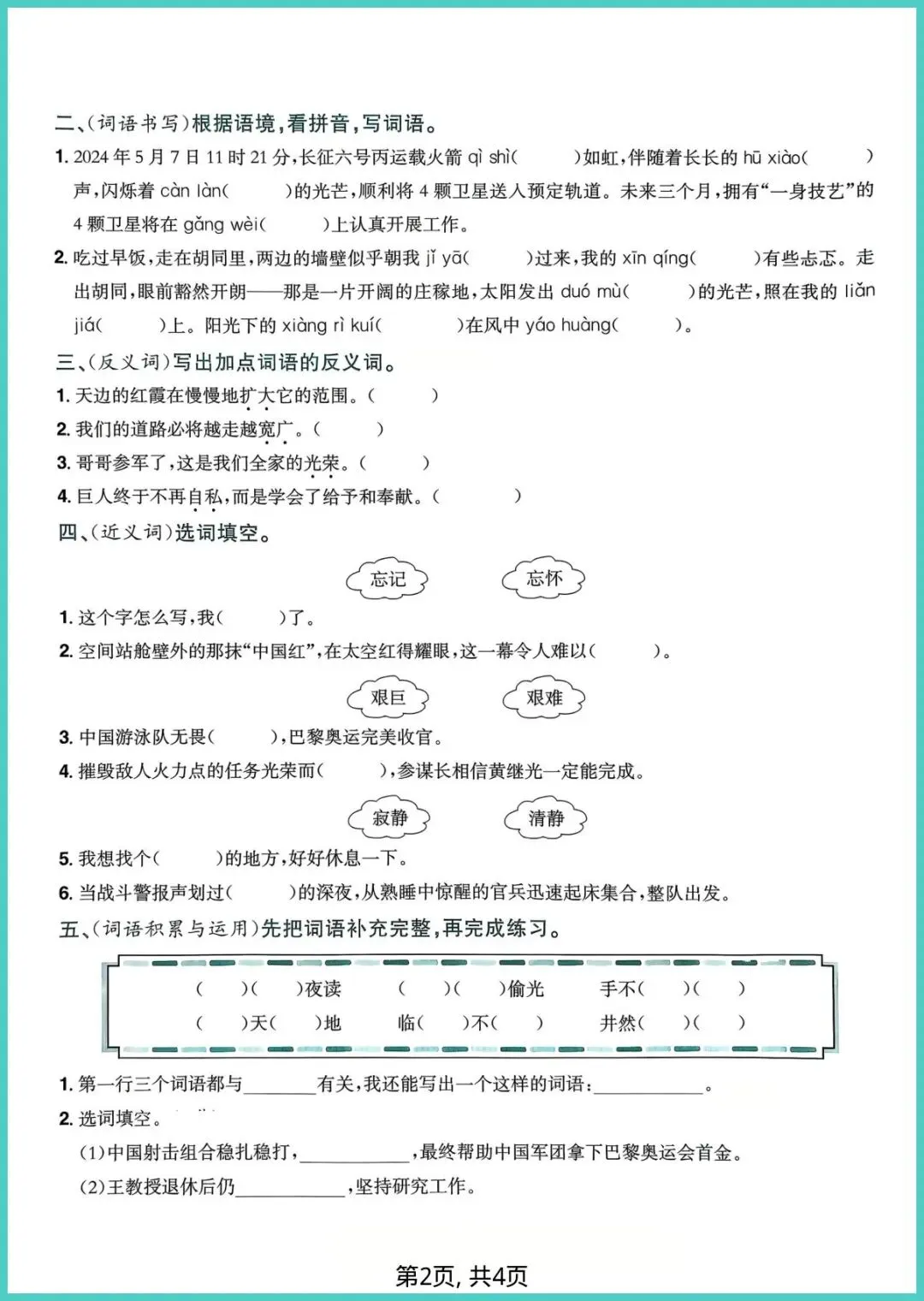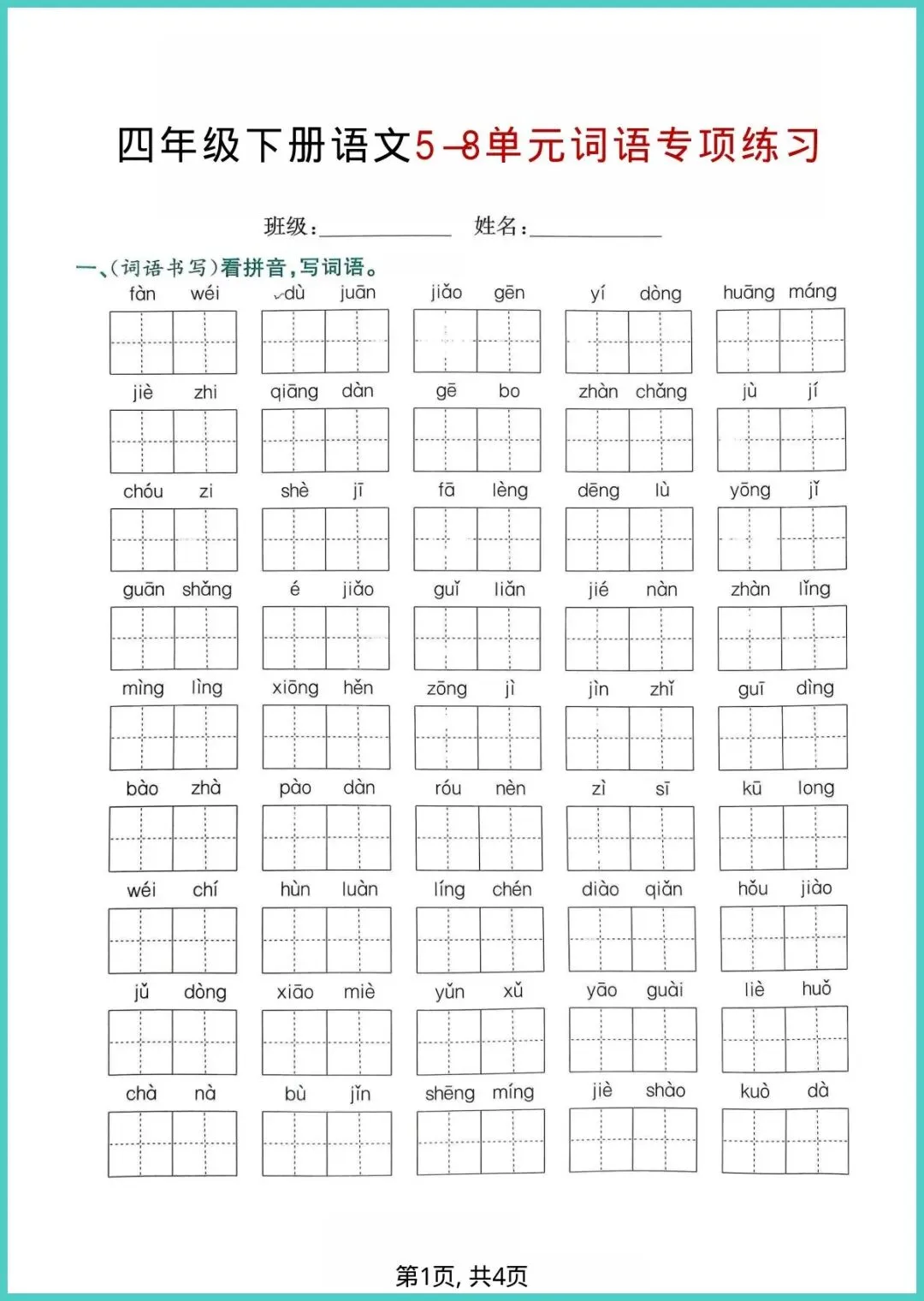 2026春人教版四年级下册语文5-8单元词语专项练习,4页电子版,一键打印!这份小册子把易错、高频、拓展词分类打包:看拼音写词语、近反义词配对、语境填空、词语接龙,四招齐下,帮孩子把“会读”变“会写”,把“死记”变“活用”。每天10分钟,词汇量悄悄翻倍,阅读作文不再词穷。家有四年级娃,赶紧打印出来,让孩子练一练,期末提分看得见!