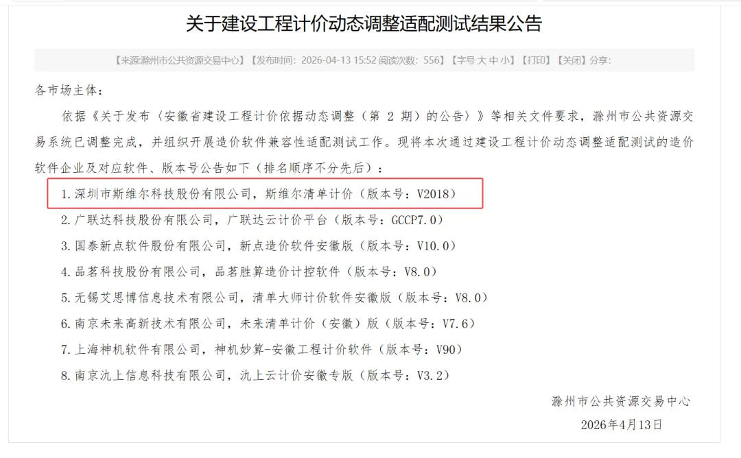 近日,滁州市公共资源交易中心官方网站发布了“关于建设工程计价动态调整适配测试结果公告”,斯维尔清单计价V2018顺利通过相关测试。